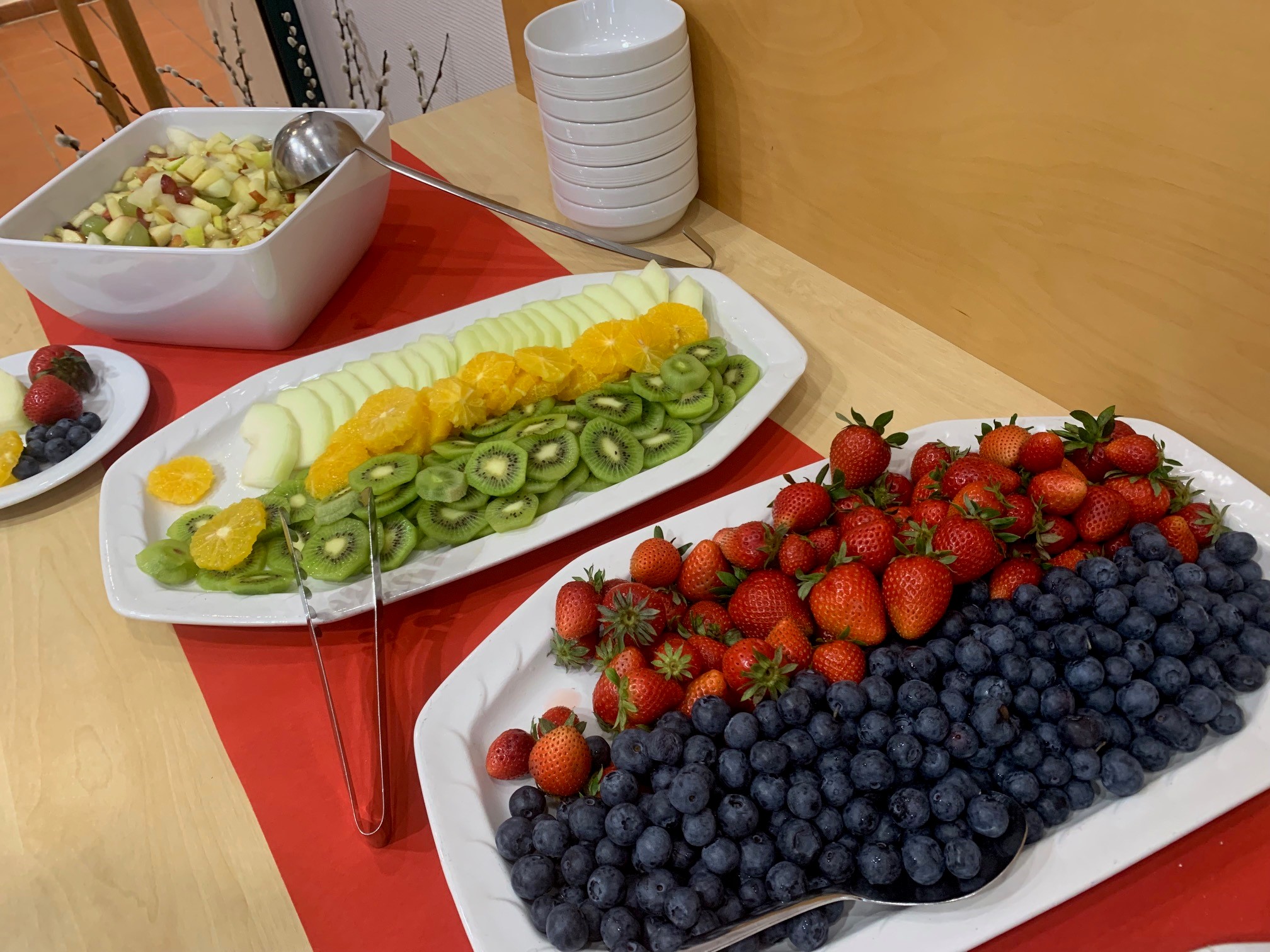 Es wurden verschiedene Käsesorten, sowohl harte als auch weiche, angeboten, ergänzt durch zarten Lachs und eine Auswahl an Wurstsorten. Für die Liebhaber von frischen und gesunden Beilagen gab es saures Gemüse und hartgekochte Eier. Auch an die süßen Genüsse wurde gedacht: Ein frischer Obstsalat, Plundergebäck sowie aufgeschnittene Früchte wie Kiwi, Apfel, Orangen, Erdbeeren und Heidelbeeren bereicherten das Buffet.