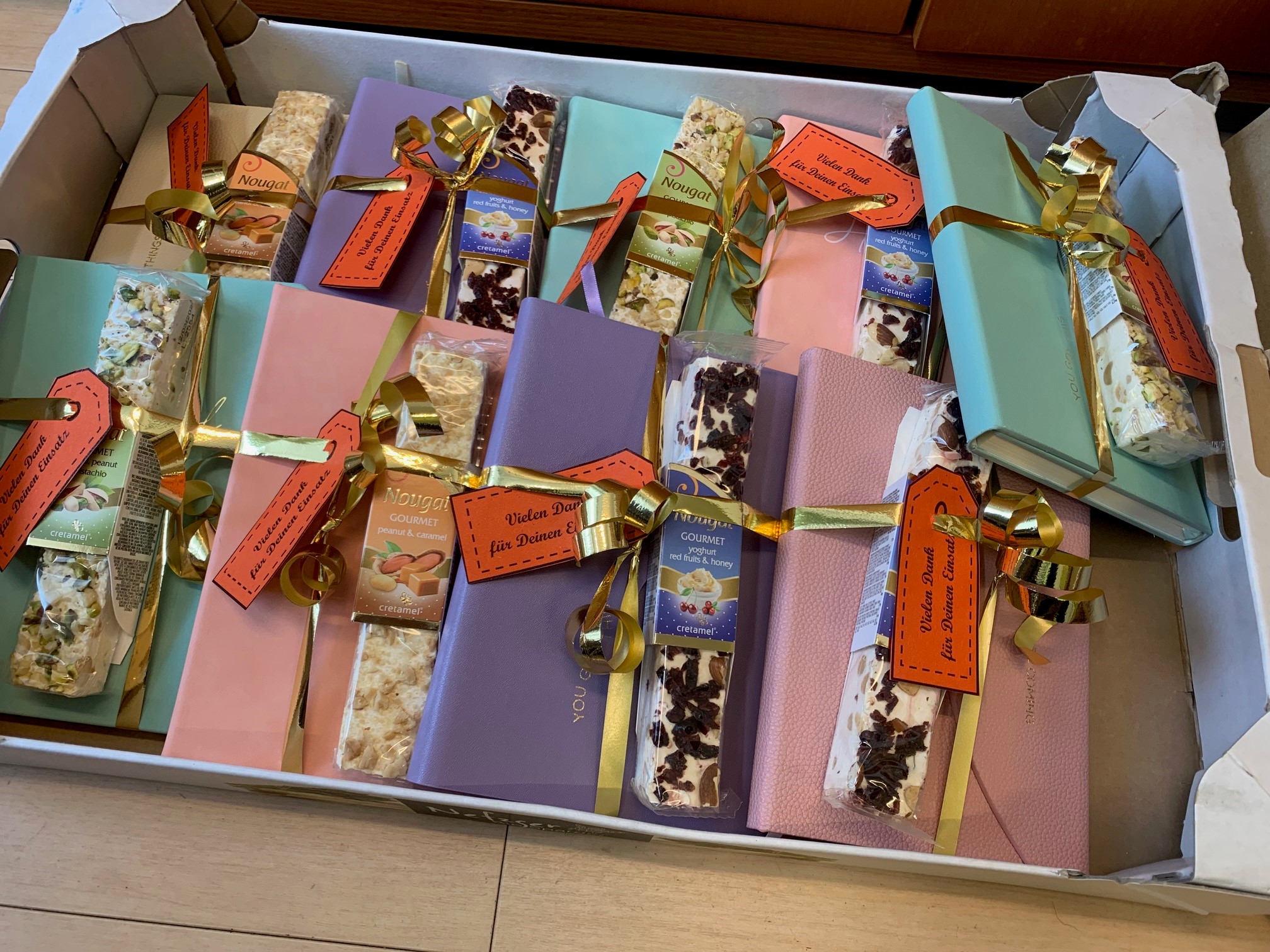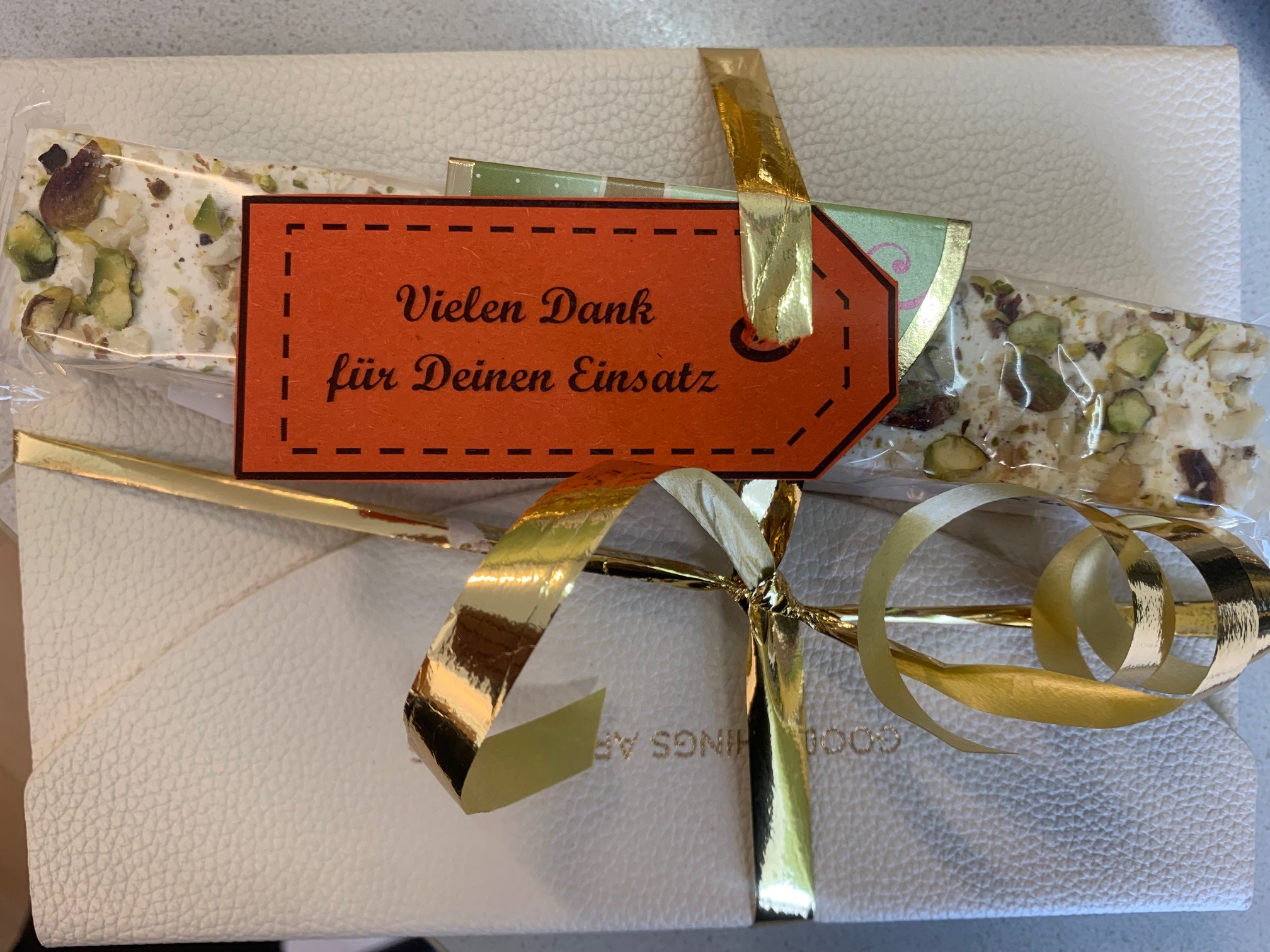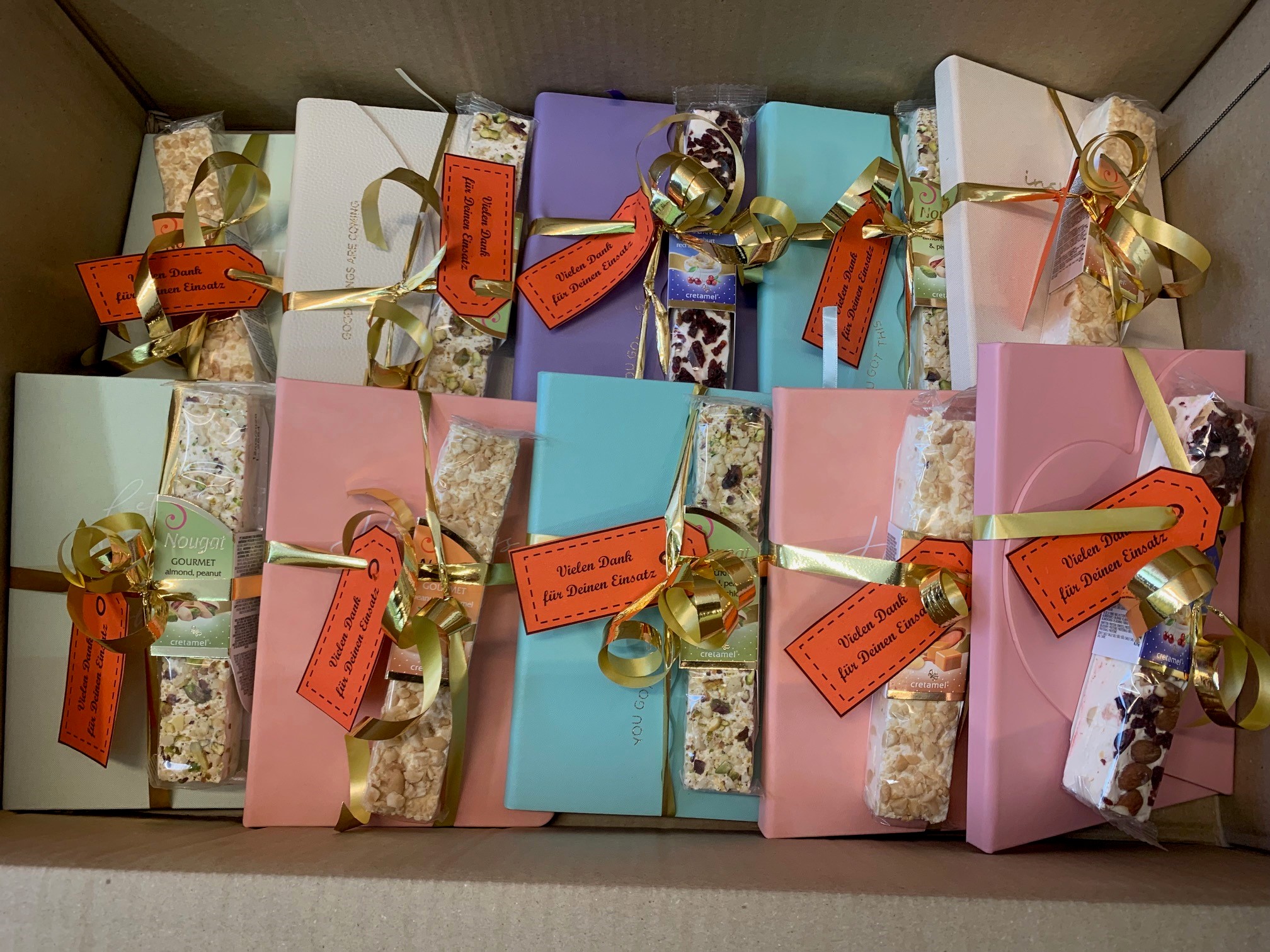 Als Zeichen der Wertschätzung haben alle Mitarbeitenden in unserem Haus einen hochwertigen Terminplaner bzw. ein Notebook sowie eine kleine süße Aufmerksamkeit in Form von feinem Nougat erhalten. Diese Geste soll unsere Anerkennung für ihren unermüdlichen Einsatz zum Ausdruck bringen.