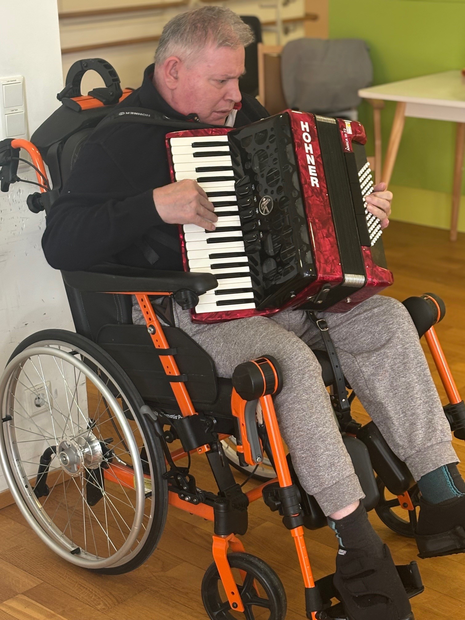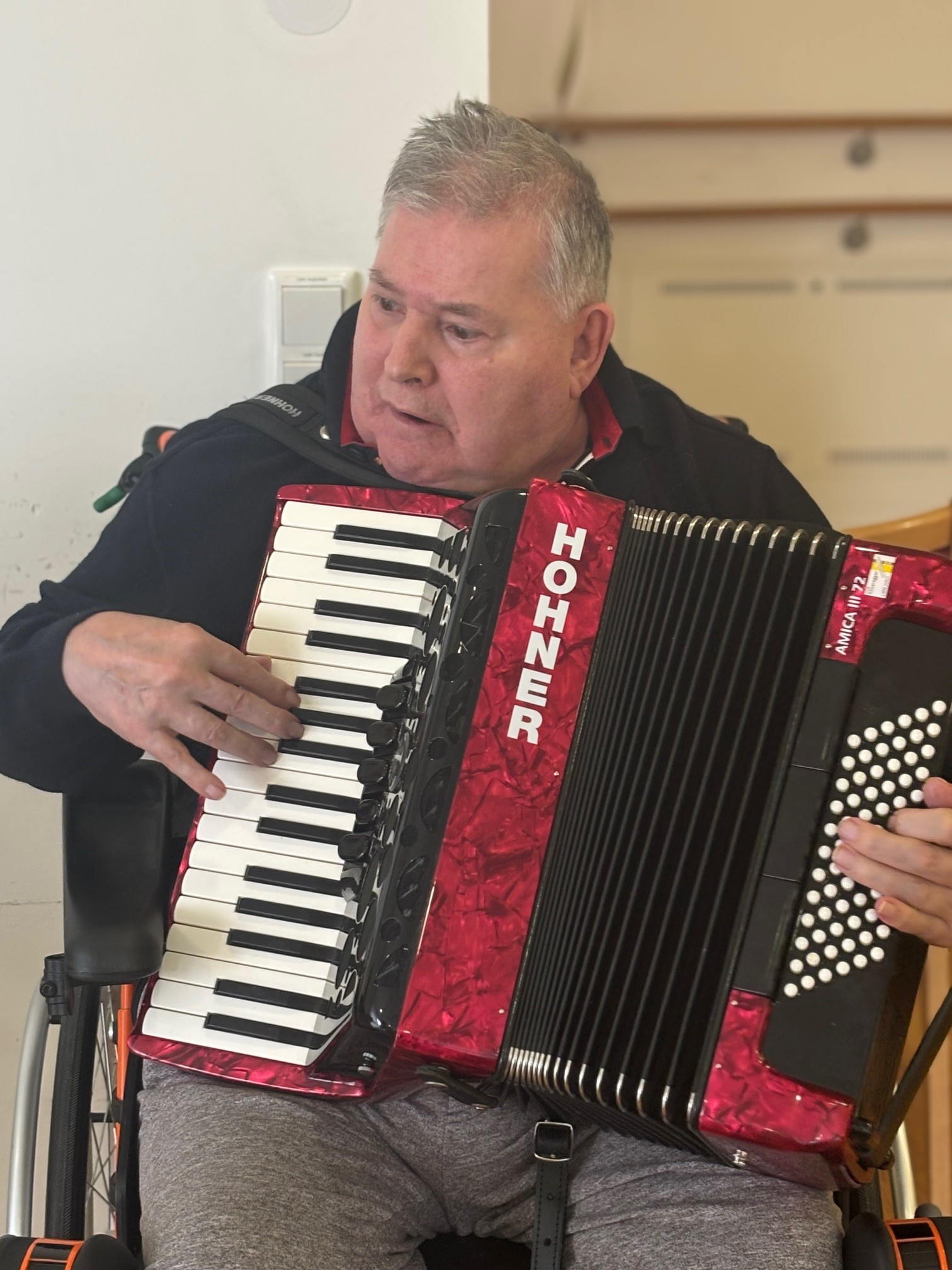 Unser Bewohner des SeneCura Sozialzentrums Dornbirn, Spiegel Lothar, verwöhnt uns und seine Mitbewohner:innen in seinem Wohnbereich immer wieder gerne mit einem Handorgelspiel. Am Nachmittag spielt er einige seiner Lieblingslieder und sorgt damit für herzliche Stimmung und Freude.